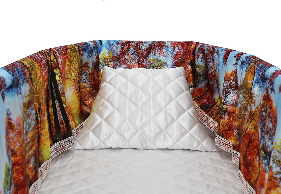 The printed interior set consists of a 12inch printed satin frill, a satin facecloth, a quilted satin pillow and a quilted satin mattress.